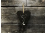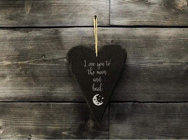 A 6mm thick Welsh slate heart, laser engraved with the phrase 'Love you to the moon and back'.